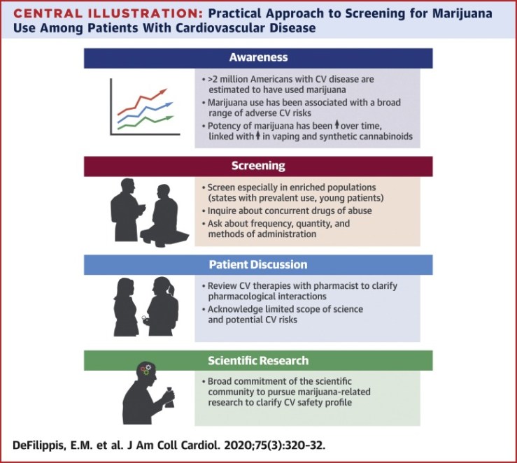 This review summarizes cardiovascular considerations related to marijuana use, pharmacological interactions, and future steps to provide clearer guidance regarding its cardiovascular safety. Screening for marijuana use is encouraged, especially in young patients presenting with cardiovascular disease.