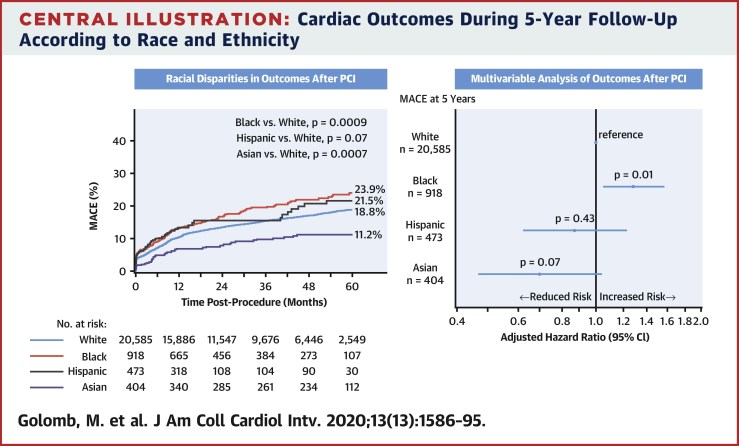 ..Among 22,638 patients, 20,585 (90.9%) were white, 918 (4.1%) were black, 404 (1.8%) were Asian, and 473 (2.1%) were Hispanic. Baseline and angiographic characteristics differed among groups. Five-year major adverse cardiac event rates were 18.8% in white patients (reference group), compared with 23.9% in black patients (p = 0.0009), 11.2% in Asian patients (p = 0.0007), and 21.5% in Hispanic patients (p = 0.07). Multivariate analysis demonstrated an independent association between black race and 5-year risk for major adverse cardiac events (hazard ratio: 1.28; 95% confidence interval: 1.05 to 1.57; p = 0.01).