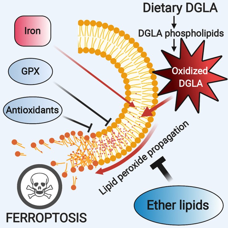 Exogenous DGLA is also sufficient to induce ferroptosis in human cells, pinpointing this omega-6 PUFA as a conserved metabolic instigator of this lethal process. In both C. elegans and human cancer cells, ether-lipid synthesis protects against ferroptosis. These results establish C. elegans as a powerful animal model to study the induction and modulation of ferroptosis by dietary fats and indicate that endogenous ether lipids act to prevent this nonapoptotic cell fate.