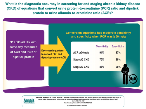 Measuring albuminuria is the preferred method for defining and staging chronic kidney disease (CKD), but total urine protein or dipstick protein is often measured instead. This analysis presents equations for converting urine protein–creatinine ratio and dipstick protein to urine albumin–creatinine ratio, and finds that both may help in CKD screening, staging, and prognosis..