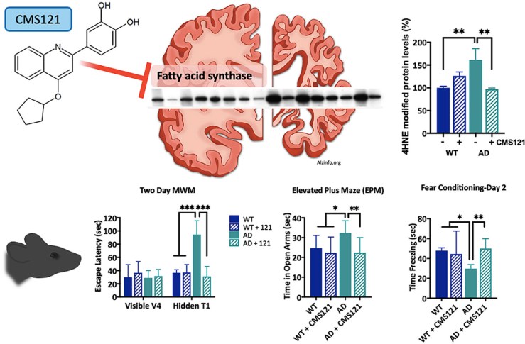 CMS121 is a small molecule developed against these aspects of neurodegeneration. Here we show that CMS121 alleviates cognitive loss, modulates lipid metabolism and reduces inflammation and lipid peroxidation in the brains of transgenic AD mice. We identify fatty acid synthase (FASN) as a molecular target of CMS121 and demonstrate that modulating lipid metabolism through the inhibition of FASN protects against several AD-related toxicities.