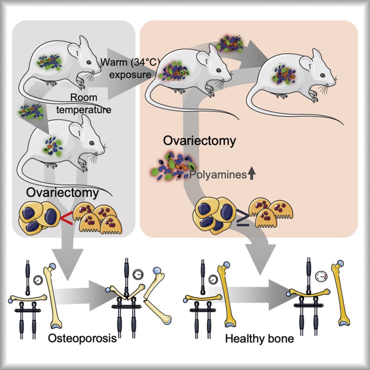 Combinatorial metagenomics/metabolomics analysis shows that warmth enhances bacterial polyamine biosynthesis, resulting in higher total polyamine levels in vivo. Spermine and spermidine supplementation increases bone strength, while inhibiting polyamine biosynthesis in vivo limits the beneficial warmth effects on the bone.