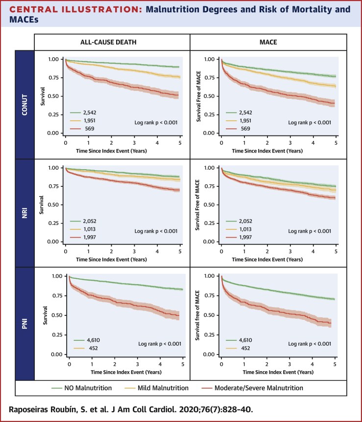 ..In this study, the Controlling Nutritional Status (CONUT) score, the Nutritional Risk Index (NRI), and the Prognostic Nutritional Index (PNI) was applied to 5,062 consecutive patients with ACS. The relationships between malnutrition risk and all-cause mortality and major cardiovascular events (MACEs) (cardiovascular mortality, reinfarction, or ischemic stroke) were examined.