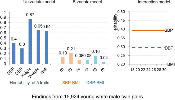 Body mass index (BMI) was used as the index of general obesity. Quantitative genetic modeling was performed using Mx software. Univariate analysis showed that narrow sense heritabilities (95% CI) for systolic BP, diastolic BP, height, and BMI were 0.401 (0.381–0.420), 0.297 (0.280–0.320), 0.866 (0.836–0.897), and 0.639 (0.614–0.664), respectively. Positive phenotypic correlations of BMI with systolic BP (r=0.13) and diastolic BP (r=0.08) were largely due to genetic factors (70% and 86%, respectively).