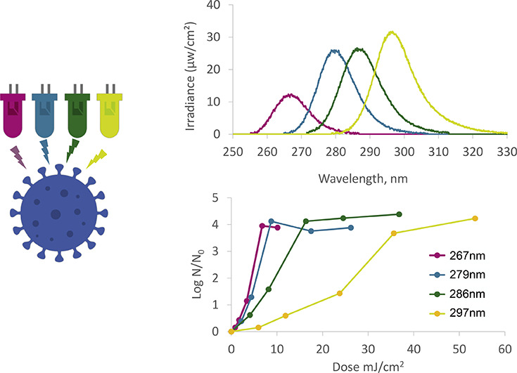 UV light-emitting diodes (UV LEDs) are an emerging technology and a UV source for pathogen inactivation, however low UV-LED wavelengths are costly and have low fluence rate. Our results suggest that the sensitivity of human Coronavirus (HCoV-OC43 used as SARS-CoV-2 surrogate) was wavelength dependent with 267 nm ~ 279 nm > 286 nm > 297 nm. Other viruses showed similar results, suggesting UV LED with peak emission at ~286 nm could serve as an effective tool in the fight against human Coronaviruses.