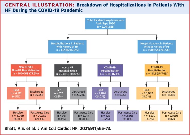 ..Among 1,212,153 patients with history of HF, 132,312 patients were hospitalized from April 1, 2020, to September 30, 2020. A total of 23,843 patients (18.0%) were hospitalized with acute HF, 8,383 patients (6.4%) were hospitalized with COVID-19, and 100,068 patients (75.6%) were hospitalized with alternative reasons. Hospitalization with COVID-19 was associated with greater odds of in-hospital mortality as compared with hospitalization with acute HF; 24.2% of patients hospitalized with COVID-19 died in-hospital compared to 2.6% of those hospitalized with acute HF.