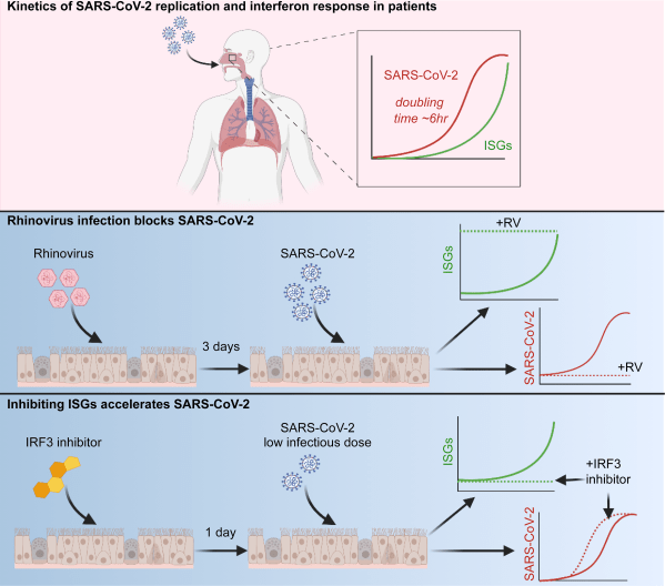 Rhinovirus infection before SARS-CoV-2 exposure accelerated ISG responses and prevented SARSCoV-2 replication. Conversely, blocking ISG induction during SARS-CoV-2 infection enhanced viral replication from a low