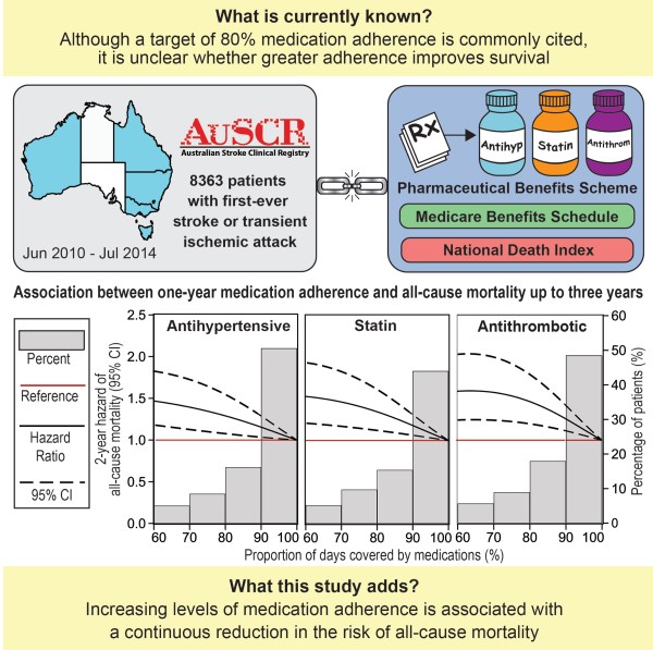 Although a target of 80% medication adherence is commonly cited, it is unclear whether greater adherence improves survival after stroke or transient ischemic attack (TIA). We investigated associations between medication adherence during the first year postdischarge, and mortality up to 3 years, to provide evidence-based targets for medication adherence.