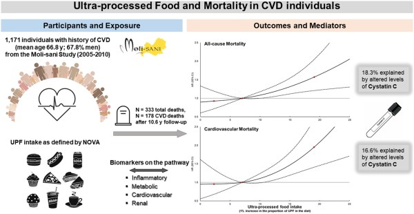 Longitudinal analysis on 1171 men and women (mean age: 67 ± 10 years) with history of CVD, recruited in the Moli-sani Study (2005–10, Italy) and followed for 10.6 years (median). Food intake was assessed using a food frequency questionnaire. UPF was defined using the NOVA classification according to degree of processing and categorized as quartiles of the ratio (%) between UPF (g/day) and total food consumed (g/day). The mediating effects of 18 inflammatory, metabolic, cardiovascular, and renal biomarkers were evaluated using a logistic regression model within a counterfactual framework. In multivariable-adjusted Cox analyses, higher intake of UPF (Q4, ≥11.3% of total food), as opposed to the lowest (Q1, UPF <4.7%), was associated with higher hazards of all-cause (hazard ratio [HR]: 1.38; 95% confidence interval (CI): 1.00–1.91) and CVD mortality (HR: 1.65; 95% CI: 1.07–2.55). A linear dose–response relationship of 1% increment in UPF intake with all-cause and CVD mortality was also observed. Altered levels of cystatin C explained 18.3% and 16.6% of the relation between UPF (1% increment in the diet) with all-cause and CVD mortality, respectively.