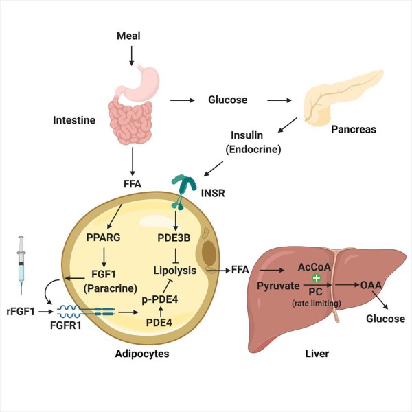•FGF1 suppresses lipolysis by inhibiting cAMP/PKA axis via PDE4D-S44 phosphorylation
