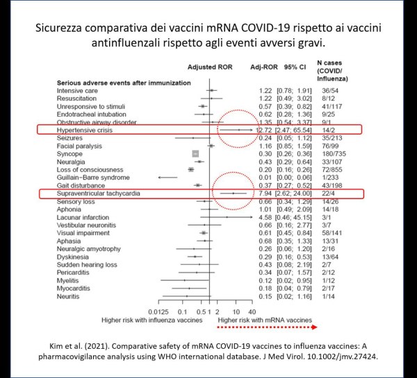 Compared to the influenza vaccine, mRNA COVID-19 vaccines demonstrated a significantly higher risk for a few manageable cardiovascular complications, such as hypertensive crisis (adjusted reporting odds ratio [ROR], 12.72; 95% confidence interval [CI], 2.47–65.54), and supraventricular tachycardia (adjusted ROR, 7.94; 95% CI, 2.62–24.00), but lower risk of neurological complications such as syncope, neuralgia, loss of consciousness, Guillain-Barre syndrome, gait disturbance, visual impairment, and dyskinesia. This study has not identified significant safety concerns regarding mRNA vaccination in real-world settings. The overall safety profile patterned a lower risk of serious AEFI following mRNA vaccines compared to influenza vaccines.