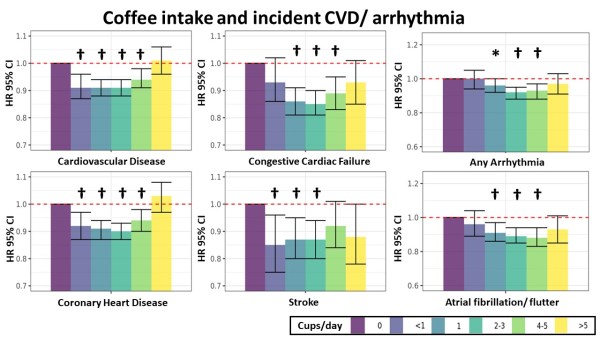 Conclusion: Regular coffee intake, particularly at 2-3 cups/day, was associated with significant reductions in incident arrhythmia, CVD and cardiovascular/all cause mortality. Daily coffee intake should be considered part of a healthy diet