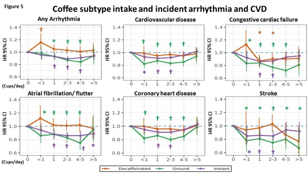 Results: There were 73027 ground, 167399 instant, 57615 decaf coffee drinkers and 84494 non coffee drinkers. Ground and instant coffee intake between 1-5 cups/day was associated with reduced arrhythmia, CVD, coronary disease, cardiac failure (CCF) and stroke risks. Lowest risk for CVD was seen at 2-3 cups/day for ground (HR0.83, CI 0.79-0.87), and instant (HR0.91, CI 0.88-0.95). Decaf coffee had a neutral effect against incident arrhythmia and CVD, with the exception of CCF. Total/ CV mortality risk was reduced with all subtypes, with the lowest total mortality at 2-3 cups/day for ground (HR 0.74, CI 0.69-0.79), instant (HR0.90, CI 0.86-0.94), and decaf (HR0.85, CI 0.80-0.91, all p <0.01)