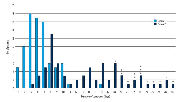 RESULTS: Patients were divided into 2 groups: group 1 (n=85) was treated at the earliest possible time (72 h after the onset of symptoms. Clinical severity at the beginning of treatment was similar in the 2 groups. In group 1, symptom duration was shorter than in group 2 (median 6.0 days vs 13.0 days, P<0.001) and no hospitalizations occurred, compared with 19.18% hospitalizations in group 2. One patient in group 1 developed chest X-ray alterations and 2 patients experienced an increase in D-dimer levels, compared with 30 and 22 patients, respectively, in group 2. The main factor determining the duration of symptoms and the risk of hospitalization was the delay in starting therapy (P<0.001).