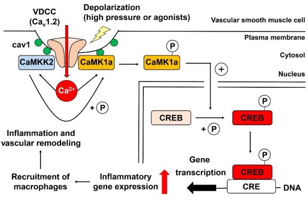 changes were reversed by inhibitors of Cav1.2, CaMKK2, and CaMK, or disruption of caveolae. In the context of pathophysiology, when the mesenteric artery was loaded by high pressure in vivo, we observed CREB phosphorylation in myocytes, macrophage accumulation at adventitia, and an increase in thickness and cross-sectional area of the tunica media. These changes were reduced in caveolin1-knockout mice or in mice treated with the CaMKK2 inhibitor STO609. In summary, E-T coupling depends on Cav1.2/CaMKK2/CaMK1a localized to caveolae, and this complex converts [Ca2+]i changes into gene transcription.