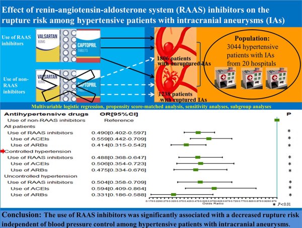Mounting experimental evidence supports the concept that the RAAS (renin-angiotensin-aldosterone system) is involved in the pathogenesis of intracranial aneurysm rupture. However, whether RAAS inhibitors could reduce the rupture risk of intracranial aneurysms remains unclear.