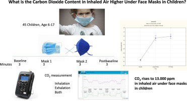 Nose and mouth covering (NMC) has been made compulsory for children in many countries during the Covid-19 pandemic. We wanted to determine the average CO2 levels in inhaled air with NMC in children between age 6 and 17. We used short term measurements under surgical masks and FFP2 masks according to European norm EN 149, compared to baseline in an experimental, intra-individually controlled study over 25 min. CO2 content was measured every 15 s using an automated dual-wavelength infrared CO2 measurement device (G100, Geotech, Leamington Spa, UK) over 25 min in a short-term experimental setting, with children seated. After baseline measurement children were provided with two types of commonly worn NMC: surgical masks and FFP2–masks in randomized sequence for 3 min each. We kept ambient CO2-levels below 1000 parts per million (ppm) through frequent ventilation. We measured breathing frequency and pulse as potential physiological moderator variables. Forty-five children, 25 boys, 20 girls, with a mean age of 10.7 years (standard deviation 2.6) were measured. We measured 13,100 ppm (SD 380) under surgical mask and 13,900 ppm (SD 370) under FFP2 mask in inhaled air. A linear model with age as a covariate showed a highly significant effect of the condition (p < 1*10−9). We measured 2,700 ppm (SD 100) CO2 at pre-baseline and 2,800 ppm (SD 100) at post-baseline, a non-significant small difference. Appropriate contrasts revealed that the change was due to the masks only and the difference between the two types of masks was small and not significant.