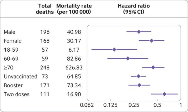 Results The risk of covid-19 death was 66% lower (95% confidence interval 54% to 75%) for omicron BA.1 compared with delta after adjusting for a wide range of potential confounders. The reduction in the risk of covid-19 death for omicron compared with delta was more pronounced in people aged 18-59 years (number of deaths: delta=46, omicron=11; hazard ratio 0.14, 95% confidence interval 0.07 to 0.27) than in those aged ≥70 years (number of deaths: delta=113, omicron=135; hazard ratio 0.44, 95% confidence interval 0.32 to 0.61, P<0.0001). No evidence of a difference in risk was found between variant and number of comorbidities.
