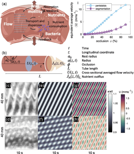 Small intestine motility and its ensuing flow of luminal content impact both nutrient absorption and bacterial growth. To explore this interdependence we introduce a biophysical description of intestinal flow and absorption. Rooted in observations of mice we identify the average flow velocity as the key control of absorption efficiency and bacterial growth, independent of the exact contraction pattern. We uncover self-regulation of contraction and flow in response to nutrients and bacterial levels to promote efficient absorption while restraining detrimental bacterial overgrowth.