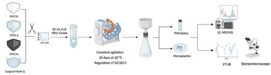 Since the outbreak of COVID-19, face masks have been introduced in the complex strategy of infection prevention and control. Face masks consist of plastic polymers and additives such as phthalates. The aim of this study was to evaluate the migration of microplastics (MP) and phthalates from face masks to water. Four types of masks including FFP2 masks and surgical were studied. Masks were first characterized to determine the different layers and the material used for their fabrication. Then, masks were cut into 20 pieces of 0.5 cm2, including all their layers, placed in water, and the migration of MP and phthalates was evaluated according to the conditions stated in EU Regulation No 10/2011 on plastic materials and articles intended to come into contact with food. For MP, the morphological analysis (shape, dimension, particle count) was performed using a stereomicroscope, while the identification of both masks and MP released was conducted using μ-Fourier-transform infrared spectroscopy (µ-FT-IR). Migration of phthalates was assessed by ultra-high-performance liquid chromatography coupled to triple quadrupole mass spectrometer (UPLC-MS/MS). Face masks analyzed in the present study were made of atactic polypropylene (PP) as stated by the manufacturer. The μ-FT-IR confirmed that PP and polyamide (PA) were released as fragments, while both PP and polyester (PES) were released as fibers. In addition, 4 phthalates were identified at concentrations between 2.34 and 21.0 µg/mask. This study shows that the migration study can be applied to evaluate the potential release of MP and phthalates from face masks to water and could give a hint for the potential impact of their incorrect disposal on the aquatic resources.