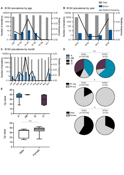 Asymptomatic blood donors can transmit human parvovirus B19 (B19V). We assessed the B19V prevalence amongst a large cohort of blood donations collected in Germany during 2015-2018. In total, 167,123 donations were screened for B19V DNA with 22 cases of viraemia identified (0.013% positive). Infections peaked at a four-year interval and the highest number of cases occurred in the summer months. All 22 infections were found in rhesus D-antigen positive donations, suggesting a protective factor in donors who lack this antigen. These findings contribute to our understanding of risk factors for B19V infection among central European blood and plasma donors.