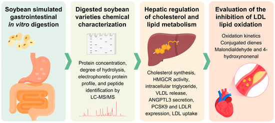 Clinical studies indicate that the consumption of soybean protein might reduce cholesterol and LDL levels preventing the development of atherosclerotic cardiovascular diseases. However, soybean variety can influence soybean protein profile and therefore affect soybean protein health-promoting properties. This study investigated the composition and effects of nineteen soybean varieties digested under simulated gastrointestinal conditions on hepatic cholesterol metabolism and LDL oxidation in vitro. Soybean varieties exhibited a differential protein hydrolysis during gastrointestinal digestion. Soybean varieties could be classified according to their composition (high/low glycinin:β-conglycinin ratio) and capacity to inhibit HMGCR (IC50 from 59 to 229 µg protein mL−1). According to multivariate analyses, five soybean varieties were selected. These soybean varieties produced different peptide profiles and differently reduced cholesterol concentration (43–55%) by inhibiting HMGCR in fatty-acid-stimulated HepG2 hepatocytes. Selected digested soybean varieties inhibited cholesterol esterification, triglyceride production, VLDL secretion, and LDL recycling by reducing ANGPTL3 and PCSK9 and synchronously increasing LDLR expression. In addition, selected soybean varieties hindered LDL oxidation, reducing the formation of lipid peroxidation early (conjugated dienes) and end products (malondialdehyde and 4-hydroxynonenal). The changes in HMGCR expression, cholesterol esterification, triglyceride accumulation, ANGPTL3 release, and malondialdehyde formation during LDL oxidation were significantly (p < 0.05) correlated with the glycinin:β-conglycinin ratio. Soybean varieties with lower glycinin:β-conglycinin exhibited a better potential in regulating cholesterol and LDL homeostasis in vitro. Consumption of soybean flour with a greater proportion of β-conglycinin may, consequently, improve the potential of the food ingredient to maintain healthy liver cholesterol homeostasis and cardiovascular function.