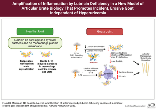 Our findings linked normouricemic erosive gout to attenuated lubricin, with impaired control of cathepsin G activity, compounded by deleterious NLRP3 variants. Lubricin suppressed monosodium urate crystallization and blunted IL-1β–induced increases in xanthine oxidase and urate in macrophages. The collective activities of articular lubricin that could limit incident and erosive gouty arthritis independently of hyperuricemia are subject to disruption by inflammation, activated cathepsin G, and synovial fibroblast TLR-2 signaling.