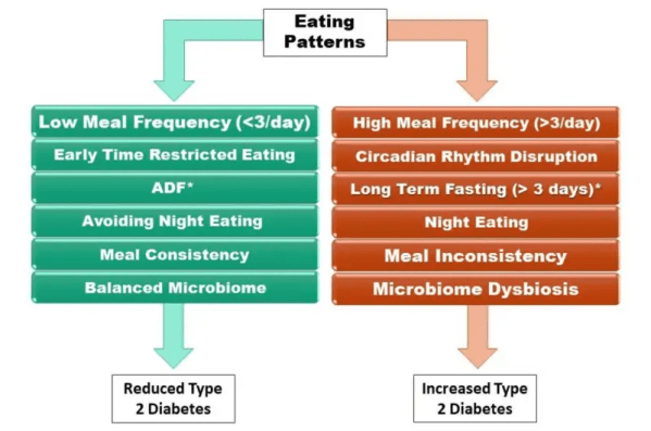 Type 2 diabetes (T2D) is a chronic condition that occurs in insulin-resistant people with reduced glucose uptake. It is contributed to and exacerbated by a poor diet that results in accumulation of adipose tissue, high blood sugar, and other metabolic issues. Because humans have undergone food scarcity throughout history, our species has adapted a fat reserve genotype. This adaptation is no longer beneficial, as eating at a higher frequency than that of our ancestors has had a significant effect on T2D development. Eating at high frequencies disrupts the circadian clock, the circadian rhythm, and the composition of the gut microbiome, as well as hormone secretion and sensitivity. The current literature suggests an improved diet requires meal consistency, avoiding late-night eating, low meal frequency, and fasting to increase metabolic health. In addition, fasting as a treatment for T2D must be used correctly for beneficial results. Early time-restricted eating (TRE) provides many benefits such as improving insulin resistance, cognitive function, and glycemic control. Alternate-day fasting (ADF), 5:2 fasting, and long-term fasting all have benefits; however, they may be less advantageous than early TRE. Therefore, eating pattern adjustments can be used to reduce T2D if used correctly.