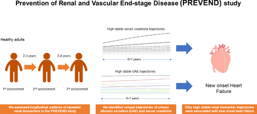 Renal dysfunction is one of the most critical risk factors for developing heart failure (HF). However, the association between repeated measures of renal function and incident HF remains unclear. Therefore, this study investigated the longitudinal trajectories of urinary albumin excretion (UAE) and serum creatinine and their association with new-onset HF and all-cause mortality.
