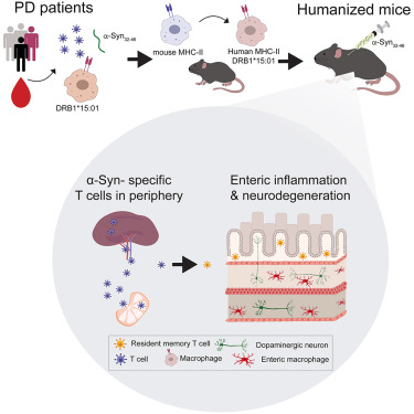 Enteric symptoms are hallmarks of prodromal Parkinson’s disease (PD) that appear decades before the onset of motor symptoms and diagnosis. PD patients possess circulating T cells that recognize specific α-synuclein (α-syn)-derived epitopes. One epitope, α-syn32-46, binds with strong affinity to the HLA-DRB1∗15:01 allele implicated in autoimmune diseases. We report that α-syn32-46 immunization in a mouse expressing human HLA-DRB1∗15:01 triggers intestinal inflammation, leading to loss of enteric neurons, damaged enteric dopaminergic neurons, constipation, and weight loss. α-Syn32-46 immunization activates innate and adaptive immune gene signatures in the gut and induces changes in the CD4+ TH1/TH17 transcriptome that resemble tissue-resident memory (TRM) cells found in mucosal barriers during inflammation. Depletion of CD4+, but not CD8+, T cells partially rescues enteric neurodegeneration. Therefore, interaction of α-syn32-46 and HLA-DRB1∗15:0 is critical for gut inflammation and CD4+ T cell-mediated loss of enteric neurons in humanized mice, suggesting mechanisms that may underlie prodromal enteric PD.