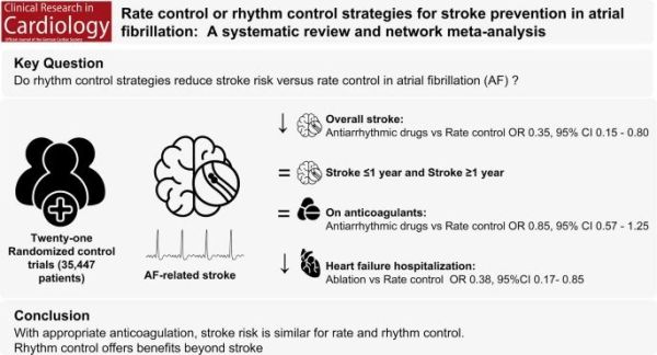 Randomized controlled trials (RCTs) comparing rate control versus rhythm control strategies were systematically searched and included in a network meta-analysis (NMA). Co-primary outcomes were stroke within 1 year and stroke beyond 1 year from randomization. Twenty-one RCTs (35,447 patients) were included in the analyses. When stroke occurring any time after randomization was considered, antiarrhythmic drugs (AAD-Alone) had lower risk (OR 0.35, 95% CI 0.15–0.80), AAD plus electrical cardioversion had higher risk (OR 4.01, 95% CI 1.32–12.13), while AAD plus rate control and ablation had similar risks, all in comparison to rate control. These differences disappeared in studies with use of anticoagulation ≥ 70% of patients. No differences were observed between rate control and individual rhythm control strategies concerning the risk for stroke within 1 year (seven studies; 19,339 patients) and beyond 1 year (10 studies; 10,325 patients). Ablation reduced the risk of heart failure hospitalization (OR 0.38, 95% CI 0.17–0.85).